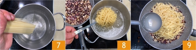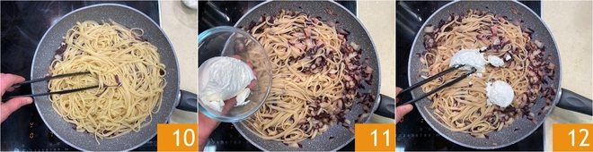 Kook de linguine in ruim gezouten water 7 en giet ze al dente af 8, bewaar wat kookwater. Doe de pasta in de pan met radicchio en voeg een soeplepel van het kookwater toe 9.