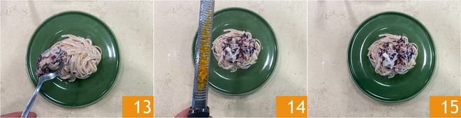 Bak alles kort door elkaar 10, voeg dan de ricotta toe 11 en roer goed door 12. Je moet een gladde, egale crème krijgen; voeg indien nodig nog wat van het pastakookwater toe.