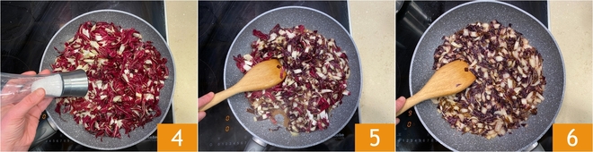 Breng op smaak met zout 4 en laat het verdampen 5. Ga door met bakken nog 3-4 minuten tot de radicchio zacht is 6.