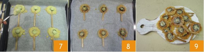Leg nu een schijfje peperoncini in het midden van elk schijfje 4 en bedek met nog een theelepel Grana Padano DOP, gebruik daarbij weer de uitsteekring 5. Als ze klaar zijn 6, bak de lolly's in een voorverwarmde statische oven op 190° gedurende ongeveer 10 minuten.