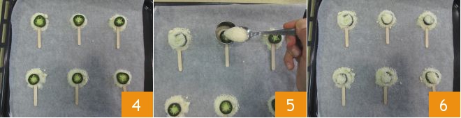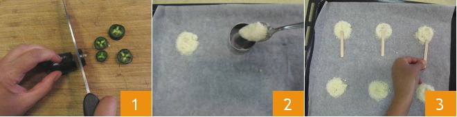 Om de peperoncini- en Grana Padano-lolly's te maken, snijd je eerst de peperoncini in plakjes van ongeveer 3 mm dik 1, rasp vervolgens de Grana Padano DOP en bekleed een bakplaat met bakpapier. Doe een theelepel geraspte Grana op de bakplaat en gebruik een uitsteekring van 4 cm diameter om 6 schijfjes te vormen die iets uit elkaar liggen 2, leg daarna een ijslollystokje aan de onderkant van elk schijfje 3.