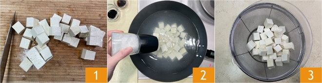 Om de mapo tofu te maken, snijd je eerst de tofu in blokjes en let je goed op dat je ze niet laat uit elkaar vallen 1. Blancheer de tofublokjes een minuut in lichtgezouten water 2, giet af en zet ze even apart 3.