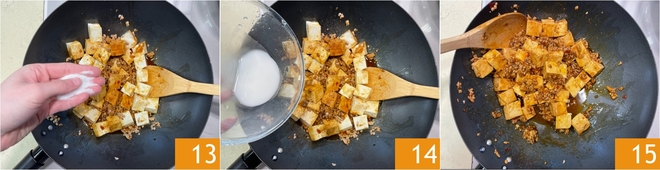 Voeg ook de suiker toe 13 en bak nog een paar minuten. Verdun intussen het aardappelzetmeel met een eetlepel water en giet het in de wok 14. Meng goed en zet het vuur uit 15.