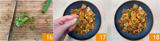 Snijd het groene deel van de lente-ui in ringetjes 16 en gebruik het om het gerecht te garneren 17. Je mapo tofu is klaar om van te genieten 18!