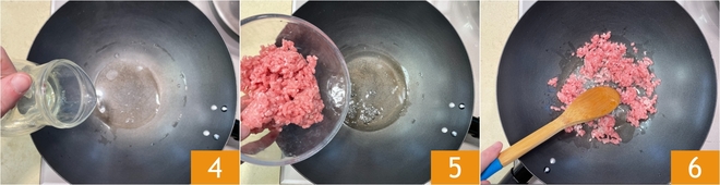 Verhit een scheutje plantaardige olie in de wok 4, voeg dan het gehakt toe 5 en bak een paar minuten, daarbij geregeld roerend 6.