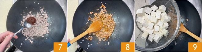 Breng op smaak met de pittige saus 7 en peper. Meng goed zodat alles gelijkmatig verdeeld is 8, voeg daarna de tofu toe 9.