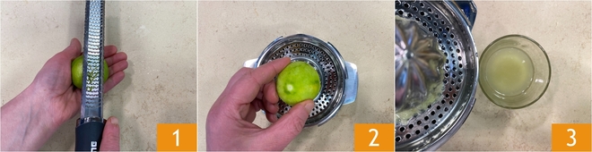 Om de limoenmayonaise te bereiden, was je de limoen grondig en rasp je vervolgens de schil met een fijne rasp, waarbij je alleen het meest aromatische groene deel opvangt 1. Snijd hem doormidden en pers het sap eruit met een citruspers 2, zeef het daarna in een glas 3.