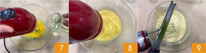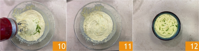 Giet nu de olie in een dunne straal erbij 7, blijf ononderbroken kloppen zodat de emulsie slaagt en je een romige, stabiele textuur krijgt 8. Wanneer het mengsel licht van kleur en dik is geworden, voeg je de geraspte limoenschil toe 9.
