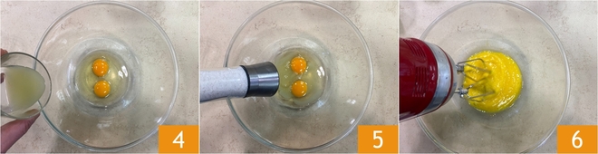 Breek de eieren in een ruime kom, voeg direct het limoensap toe 4 en het zout 5 en begin het mengsel met de elektrische garde te kloppen tot het egaal is 6.