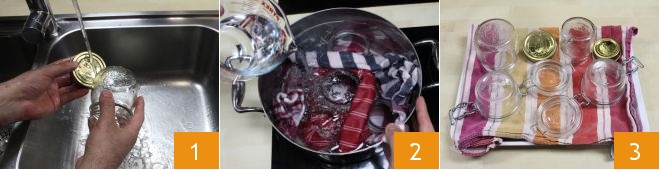 Om meloenconserve met port te maken, zorg je eerst voor glazen potten en steriliseer je ze, zoals aangegeven in de richtlijnen van het Ministerie van Volksgezondheid die onderaan het recept staan. Spoel ze eerst grondig af onder stromend water 1 en zet ze dan in een pan 2. Leg er ook keukendoeken tussen, zodat de potten elkaar tijdens het koken niet raken. Vul de pan met water tot de potten onderstaan. Zodra het water kookt, zet je het vuur lager en laat je het ongeveer 30 minuten doorkoken. Dompel 10 minuten voordat je de potten afgiet ook de deksels onder om ze mee te steriliseren. Als de sterilisatietijd voorbij is, zet je het vuur uit en laat je alles afkoelen. Haal daarna de potten uit de pan 3 en zet ze omgekeerd op een droge doek, zodat ze helemaal kunnen drogen.