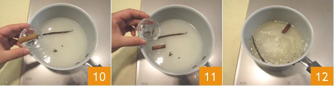 Voeg ook het stokje zelf toe, het kaneelstokje 10 en de kruidnagels 11. Breng alles aan de kook 12.
