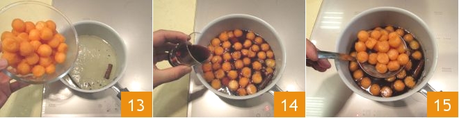 Zodra de siroop kookt, zet je het vuur uit en voeg je de meloen 13 en de port 14 toe. Laat 15 minuten rusten en schep dan met een schuimspaan de meloen eruit 15 en zet apart.