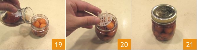 Zeef nu de kookvloeistof en vul elk potje 19, zodat de meloen helemaal onderstaat, maar houd 1 centimeter vrij tot aan de rand. Naar wens kun je ook de kruidnagels, kaneel en vanille toevoegen en gelijkmatig over de potten verdelen. Plaats het gewichtje 20 en sluit vervolgens elk potje 21. Als je potten met een schroefdeksel gebruikt, draai je het deksel goed vast, maar niet te strak. Daarna kun je overgaan tot het uitkoken, oftewel pasteuriseren, volgens de aanwijzingen in de richtlijnen van het Ministerie van Volksgezondheid die onderaan het recept worden genoemd. Gebruik je potten met schroefdeksel, controleer dan zodra de potten zijn afgekoeld of het vacuüm goed is ontstaan: je kunt in het midden van het deksel drukken en als je geen typische "klik-klak" hoort, is het vacuüm gevormd. Gebruik je potten met een rubberen ring, dan kun je bij het openen de vacuümtest doen door aan het lipje te trekken: als dat een droog, scherp geluid geeft, betekent het dat de inhoud onder goed vacuüm is bewaard. Als de ring daarentegen "slap" aanvoelt wanneer je aan het lipje trekt, is er geen goed vacuüm ontstaan en kun je de inhoud beter niet eten. Je meloenconserve met port is klaar om van te genieten!