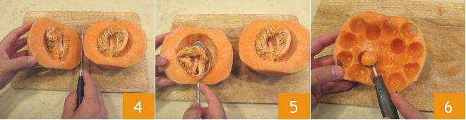Ga verder met de meloen. Snijd hem doormidden 4 en verwijder met een lepel de pitten en de draderige binnenkant 5. Schep vervolgens met een meloenbolletjeslepel het vruchtvlees uit tot bolletjes 6 en zet die apart.