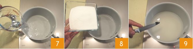 Doe in een ruime pan het water 7 en de suiker 8. Snijd een vanillestokje in de lengte open, schraap met de punt van een klein mesje het merg eruit en doe dat in het pannetje 9.