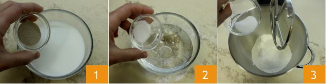 Om monkey bread te maken begin je met het deeg: los de gedroogde gist in een klein kommetje op in lauwwarme melk 1 (als alternatief kun je 12 g verse bakkersgist gebruiken). Doe in een ander kommetje het water en voeg het zout toe 2, roer zodat het zout oplost. Doe de gezeefde bloem in de kom van een standmixer en voeg de suiker toe 3.