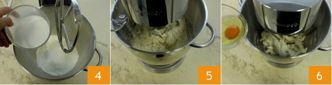 Giet ook de melk waarin je de gist hebt opgelost erbij 4 en zet de gardes op middelhoog toerental. Voeg daarna het water waarin je het zout hebt opgelost toe 5, het hele ei 6 en wanneer dat volledig is opgenomen, voeg je ook de eidooier toe, terwijl de mixer blijft draaien.