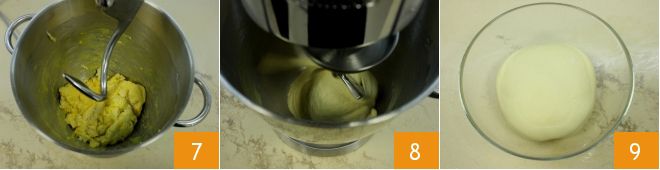 Als ook de eieren volledig zijn opgenomen, zet je de deeghaak op 7 en blijf je het deeg kneden tot het zacht en homogeen is 8. Doe het vervolgens in een kom 9, dek af met vershoudfolie en laat het rijzen bij een temperatuur tussen 26-28° gedurende ongeveer 2 uur.