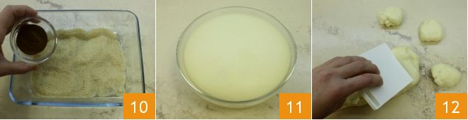 Als het deeg in volume verdubbeld is, maak je de coating klaar: smelt de boter in een pannetje en giet die in een klein kommetje; in een ander kommetje doe je de bruine suiker en de kaneel 10. Neem nu het deeg 11, kneed het even op het werkblad en vorm bolletjes van ongeveer 2-3 cm 12: dat zijn de bolletjes die de karakteristieke vorm van het gebak geven.