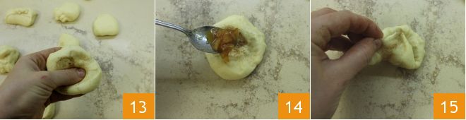 Maak met je vinger een holte in elk bolletje 13 en vul het met een theelepel sinaasappeljam 14. Sluit de bolletjes goed door de randen goed samen te drukken 15.