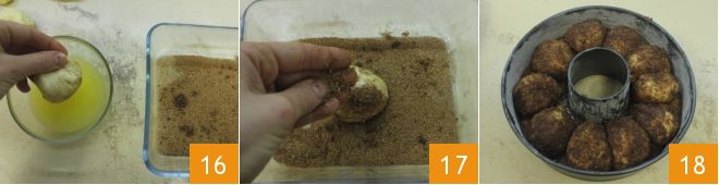 Rol de bolletjes eerst door de gesmolten boter 16 en daarna door het mengsel van bruine suiker en kaneel 17. Vet en bestuif een hoge, diepe tulbandvorm met boter en bloem en plaats de bolletjes dicht tegen elkaar, eerst een onderlaag en daarna een bovenlaag 18.