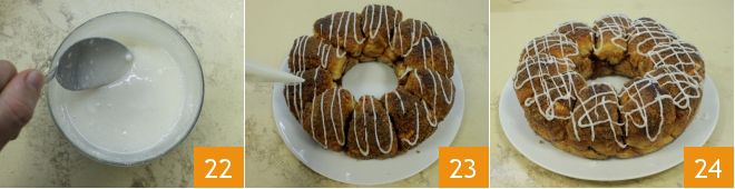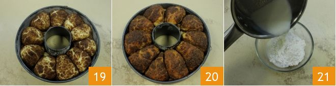 Laat het monkey bread ongeveer een uur rijzen op kamertemperatuur 19. Bak het daarna in een voorverwarmde oven op onder- en bovengrondte van 190° gedurende 40 minuten (bij heteluchtoven 170° gedurende 30-35 minuten): aan het einde van de baktijd moet het monkey bread goudbruin zijn 20. Terwijl het gebak in de oven staat, kun je de melkglazuur maken: breng de melk aan de kook in een pannetje en giet deze vervolgens al roerend in een kom met gezeefde poedersuiker 21.