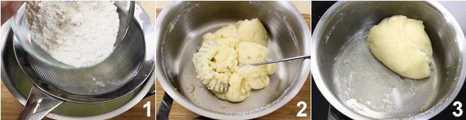 Om de mysterieuze pompoentjes te maken begin je met het bereiden van de soesjes: doe 100 ml water in een steelpan met de boter in stukjes en een snufje zout. Zodra het water begint te koken, haal je de pan van het vuur en voeg je de gezeefde bloem toe 1, goed en snel roeren zodat er geen klontjes ontstaan 2. Zet daarna de pan terug op het vuur en, op laag vuur, roer je snel en krachtig met een houten lepel: het mengsel zal snel stevig en zacht worden en loslaten van de wand, waardoor er een bal ontstaat. Wanneer er een wit laagje op de bodem van de pan verschijnt 3,