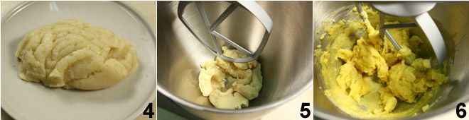 haal het deeg van het vuur en laat het volledig afkoelen door het op een bord te leggen 4. Doe het mengsel vervolgens in een keukenmachine met platte klopper 5 (als je geen keukenmachine hebt kun je alles ook met de hand doen met een houten lepel) en voeg de eieren beetje bij beetje en heel langzaam toe aan het koude mengsel 6, stevig roeren zodat ze goed in het deeg opgenomen worden.
