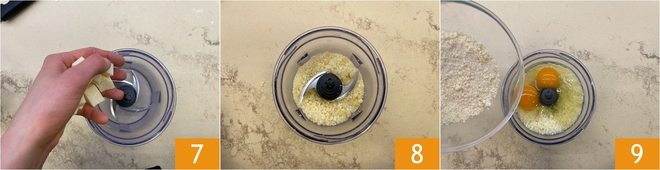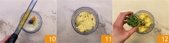Pureer deze in de keukenmachine 7 tot je een kruimelig mengsel hebt 8, voeg daarna de eieren en de geraspte Parmigiano Reggiano toe 9.