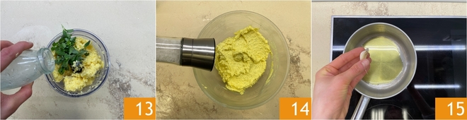 Als het te compact lijkt, voeg dan een scheutje water toe 13, breng op smaak met zout 14 en schep het mengsel in een spuitzak zonder mondstuk. Laat de vulling 30 minuten in de koelkast rusten. Maak de saus: bak het teentje knoflook in de olie in een pan 15.