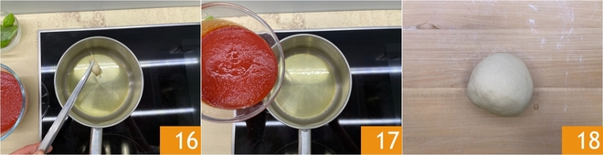 Verwijder de knoflook en voeg de passata van tomaat toe, breng op smaak met een snuf zout en laat ongeveer 15 minuten zachtjes koken. Neem intussen het deeg weer 18.
