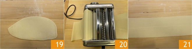 Neem een portie en rol deze met de deegroller plat om hem te vormen 19, haal hem vervolgens door de rollen van de pastawals, beginnend op de grootste stand 20 totdat je een deegvel van 1 mm dikte hebt 21.