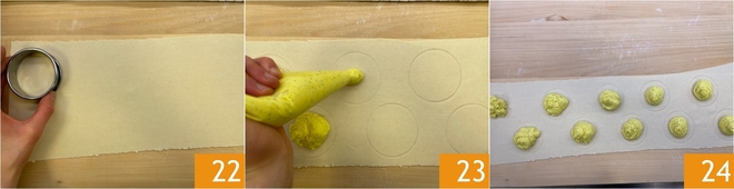 Gebruik een uitsteker van 6 centimeter (met het snijgedeelte naar boven) en druk licht op het deeg zodat er cirkels ontstaan die je op een praktische manier helpen bij het vullen 22. Spuit in het midden van deze cirkels hoopjes vulling 23 24.