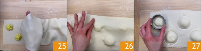 Bedek met een ander deegvel van dezelfde maat 25 en druk het deeg rond de vulling aan om de lucht te laten ontsnappen 26, verzegel ze daarna weer met dezelfde uitsteker 27.