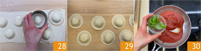 Snijd nu de ravioli uit met een gegolfde uitsteker van 8 cm 28; met deze hoeveelheden krijg je ongeveer 24 ravioli 29. Doe nu de gekookte saus in een ruime pan en geef het aroma met verse basilicum 39.