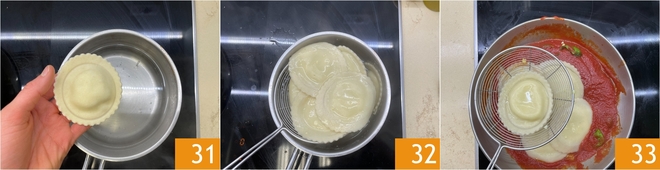Kook de ravioli in gezouten water gedurende ongeveer 5 minuten 31, draai ze voorzichtig tijdens het koken, giet ze daarna af 32 en schep ze direct in de pan met de saus 33.