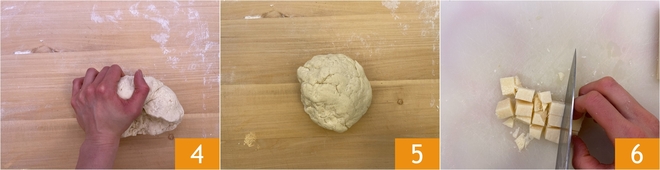 Blijf kneden 4 totdat het deeg glad en homogeen wordt. Vorm een bolletje 5, wikkel het in huishoudfolie en laat het een halfuur in de koelkast rusten, dan is het makkelijker te verwerken. Neem intussen de vulling onder handen: snijd de caciotta in blokjes 6.