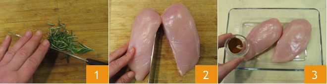 Om de kipfilet uit de oven met tomaat en mozzarella te maken, hak je eerst de rozemarijn fijn 1. Snijd de kipfilet doormidden 2, leg hem in een kom en kruid met paprikapoeder 3.