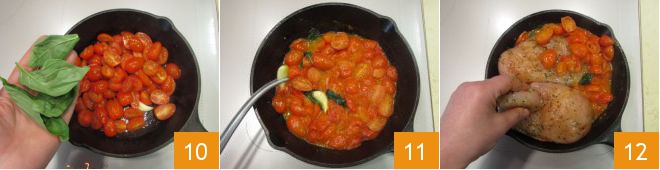 Geef smaak met blaadjes basilicum 10 en laat op laag vuur 10 minuten sudderen. Haal na die tijd de knoflookteentjes eruit 11 en voeg de kipfilet toe 12.