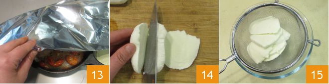 Dek af met aluminiumfolie 13 en zet in een voorverwarmde oven op 200 °C gedurende 25 minuten. Snijd intussen de mozzarella in plakken 14 en laat deze uitlekken op een zeef 15 zodat het wei verliest.