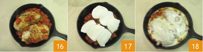 Na 25 minuten verwijder je de aluminiumfolie en bak je nog 10 minuten. Haal de kip uit de oven 16, leg de plakken mozzarella op de filets 17 en zet nog ongeveer 5 minuten onder de grill op 240 °C, precies lang genoeg om de mozzarella te laten smelten. Serveer de kipfilet uit de oven met tomaat en mozzarella heet en lekker smeuïg 18.