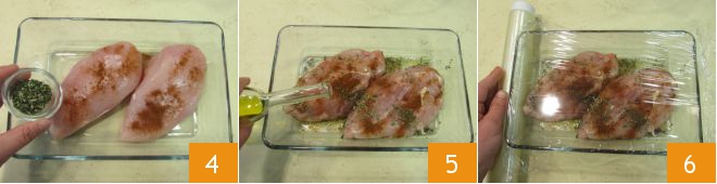 Voeg vervolgens de rozemarijn toe 4, zout en peper naar smaak en besprenkel met olijfolie 5. Wrijf de smaakmakers goed in het vlees, dek af met vershoudfolie 6 en zet even weg.
