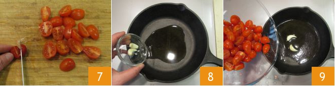 Was nu de cherrytomaatjes en halveer ze 7. Doe in een ovenbestendige koekenpan een scheut olijfolie, voeg ook twee teentjes knoflook toe en laat een minuut of twee intrekken. Voeg dan de tomaatjes toe 9.