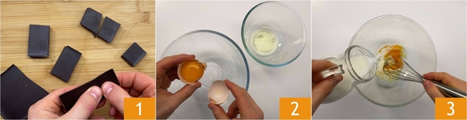 Om de met chocolade gevulde pancakes te bereiden, breek je eerst de chocoladereep in 8 stukjes van gelijke grootte 1. Leg ze apart en smelt ondertussen de boter en laat deze licht afkoelen. Scheid intussen de eiwitten van de dooiers in twee aparte kommen 2. Klop de dooiers met een garde en voeg, terwijl je blijft roeren, langzaam de melk in een dun straaltje toe 3.