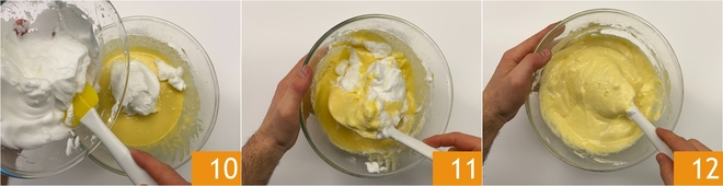 Vouw ze voorzichtig door het eiermengsel 10 met bewegingen van boven naar beneden 11, om te voorkomen dat ze inzakken 12.