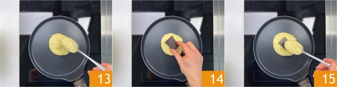 Verwarm op middelhoog vuur een ruime anti-aanbakpan, bij voorkeur met dikke bodem en vet deze zonodig licht in met wat boter die je met keukenpapier uitsmeert. Giet in het midden van de pan 2 eetlepels van het beslag 13; je hoeft het niet uit te smeren. Leg in het midden het stukje chocolade 14 en dek af met nog een eetlepel beslag 15.