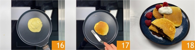 Wanneer er belletjes aan de oppervlakte verschijnen 16, draai je de pancake om met een spatel 10. Laat ook de andere kant goudbruin worden 17 en binnen een paar minuten is hij klaar. Herhaal dit voor alle andere pancakes; je krijgt er 8. Garneer met frambozen en licht opgeklopte slagroom 18.