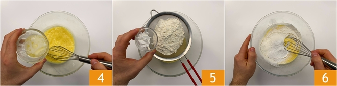 Als alles goed is opgenomen voeg je de inmiddels lauwe boter toe 4 en klop je nog even met de garde. Klop het mengsel totdat het lichter van kleur wordt. Zeef de bloem en het bakpoeder boven de kom 5 en roer met de garde om alles goed te mengen 6.