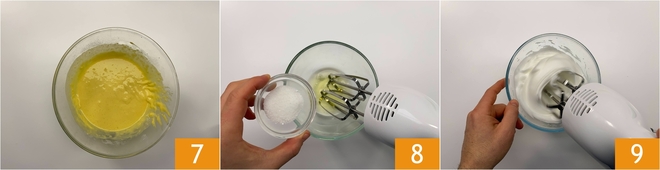 Je moet een glad beslag zonder klontjes krijgen 7. Klop nu de eiwitten die je apart hebt gezet, voeg beetje bij beetje de suiker toe 8 totdat ze wit en schuimig zijn 9.