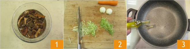 Om de pappardelle met linzen- en paddenstoelenragù te bereiden, spoel je eerst de gedroogde paddenstoelen af en zet je ze vervolgens minstens 10-15 minuten in koud water 1, net lang genoeg om de rest voor te bereiden. Ga nu verder met de linzenragù: maak wortel, selderij en ui schoon en hak ze fijn 2. Giet de extra vierge olijfolie in een braadpan 3.
